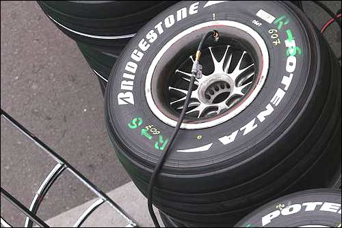 Когда шины одевают на оснастку, инженеры Bridgestone повышают давление в своих Potenza до 50 PSI (около 3.5 атмосфер или, если хотите — 2585,75 мм ртутного столба). Команды получают шины с давлением в 20 PSI, при этом в них накачан атмосферный воздух, прошедший через осушающий фильтр. Осушение необходимо для компенсации изменения уровня влажности, а значит и давления, при нагреве резины, которое может быть достаточно большим — около 8 PSI, что мешает точной настройке подвески, при определенных условиях погрешности складываются и система подвеска–шины выходит из рабочего режима.