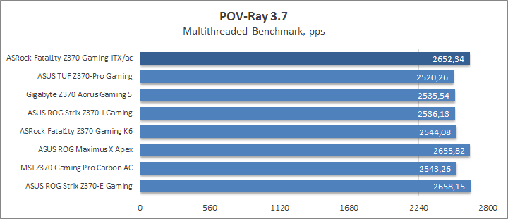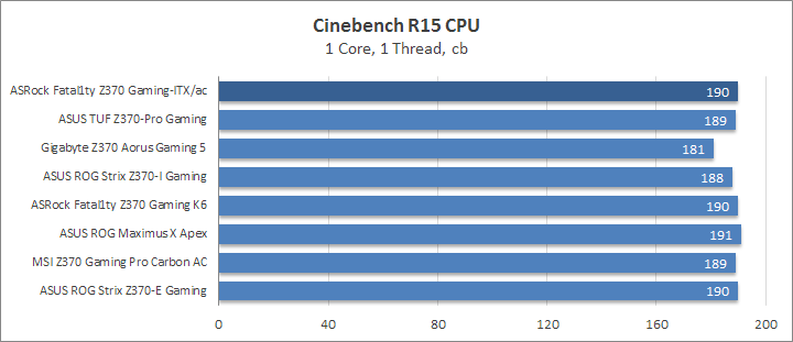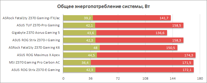 Сравнение цифр у двух моделей ASRock демонстрирует явное превосходство компактной платы над габаритной ATX-версией. Справедливости ради, отмечу высокие отметки для CPU IO и SA Voltages у обоих устройств, как, в общем, это было с каждой из протестированных плат. Для памяти тут характерными были 1,392 В, а вот для ЦП напряжение составляло 1,12–1,152 В, оно зависело от числа нагрузочных потоков в данный момент времени. По этой части Fatal1ty Z370 Gaming-ITX/ac заслуживает похвалы, да и в целом всё указывает на высокий КПД преобразователя питания.