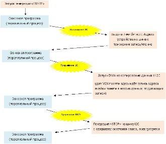 Результат – стабильная работа «квадратной шины» с, практически, параллельной работой ядра над другими задачами. Это стало возможным благодаря использованию контроллера прямого доступа к памяти и прерываний. Ниже показано, как работает стек обмена данными по интерфейсу I2C.
