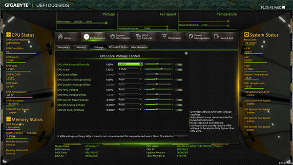 Для разгона процессора Intel Core i7-4770K в настройках BIOS блокировалась технология Intel Turbo Boost, а сам разгон производился путем увеличения коэффициента умножения при трех (1,00, 1,25 и 1,66) значениях частотного множителя, то есть для опорной частоты ядер процессора 100, 125 и 166 МГц. Частота памяти составляла 1333 МГц (за счет подбора коэффициента умножения). Опорная частота для элементов Uncore Logic при этом составляла 100 МГц.