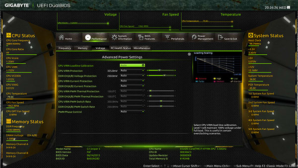 Отметим, что если в процессорах Sandy Bridge и Ivy Bridge при разгоне иногда возникала необходимость корректировать проседание напряжения под нагрузкой, то в процессорах Haswell, за счет интегрированного регулятора напряжения питания, значение проседания напряжения мало даже при высоких нагрузках. Тем не менее, на некоторых (но далеко не на всех) платах под процессоры Haswell предусмотрена возможность компенсации падения напряжения при загрузке процессора. Эта технология называется Load Line Calibration (LLC), то есть компенсация нагрузочной кривой. Иногда встречаются и другие обозначения, например Processor VR Droop Control. На разных платах предусмотрены различные опции для функции LLC. Это могут быть уровни компенсации (к примеру, может быть пять уровней), LLC может выражаться в процентах, а могут быть и такие малопонятные значения, как High V-droop (Power Saving), Mid V-droop и Low V-droop (Performance).